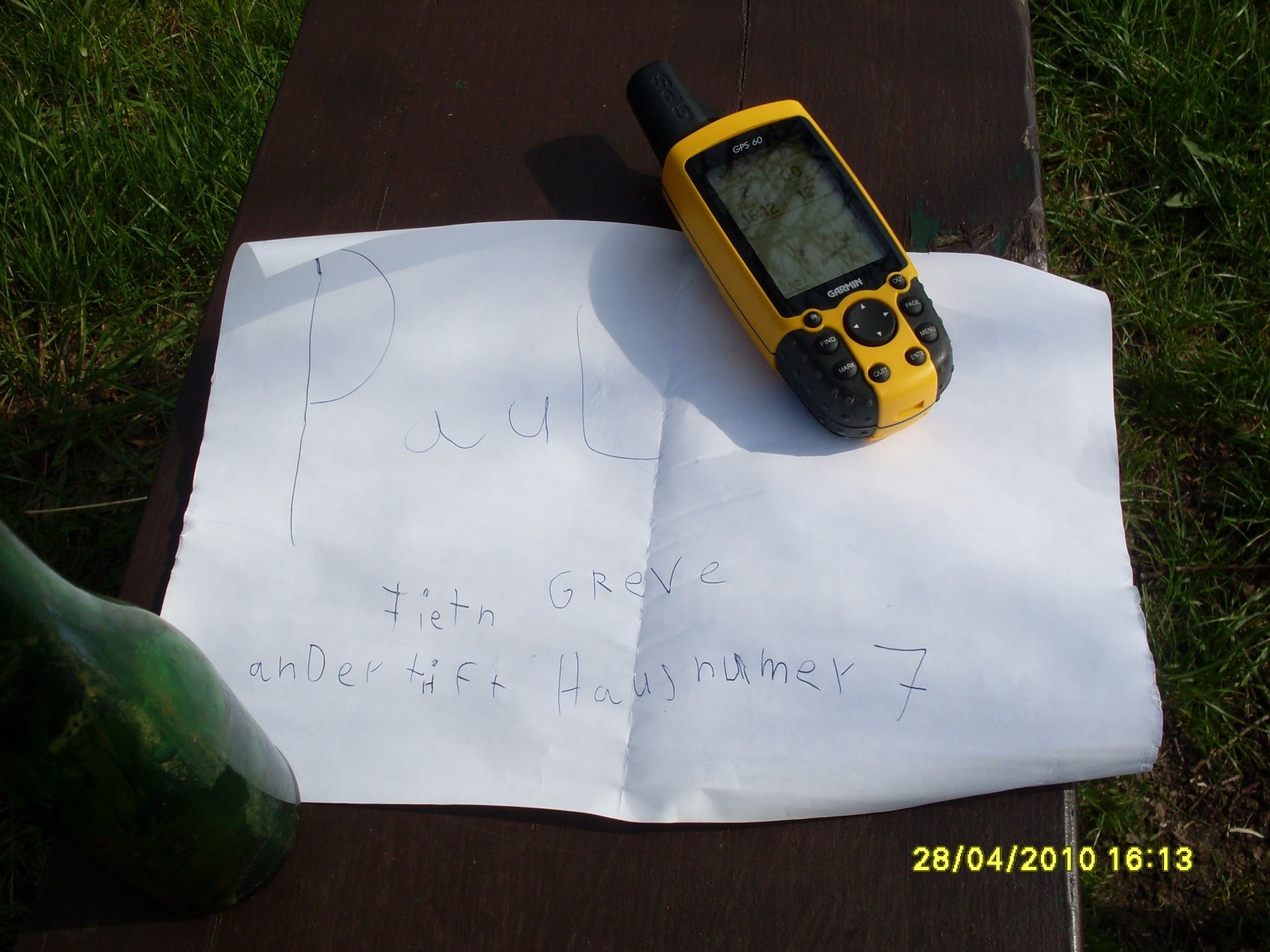 Die Flaschenpost wurde vermutlich von einem Kind, der Schrift nach zu urteilen, eingeworfen. Leider steht nur die Adresse “Paul Fietn GReVe an Der trift Hausnummer 7” auf dem Zettel. Ich habe mir erlaubt den Fundort, das Datum, meine Adresse und einen Hinweis auf diese Webseite dazuzuschreiben und die Flasche wieder